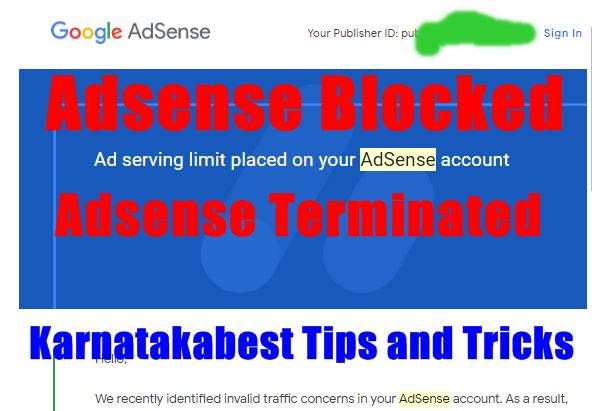 | We recently identified invalid traffic concerns in your AdSense account. As a result, we have introduced an ad serving limit on your account. We will automatically review and update this limit as we continue to monitor your traffic. ಮೇಲಿನ ಸೂಚನೆ ಬಂದರೂ, ಬರದಿದ್ದರೂ, ನೀವು ಇನ್ವ್ಯಾಲಿಡ್ ಕ್ಲಿಕ್ ಮುಂದುವರೆಸಿದರೆ ನಿಮ್ಮ ಆಡ್ಸೆನ್ಸ್ ಖಾತೆ ೩೦ ದಿನಗಳ ಕಾಲ ಬ್ಲಾಕ್ ಆಗಬಹುದು. |